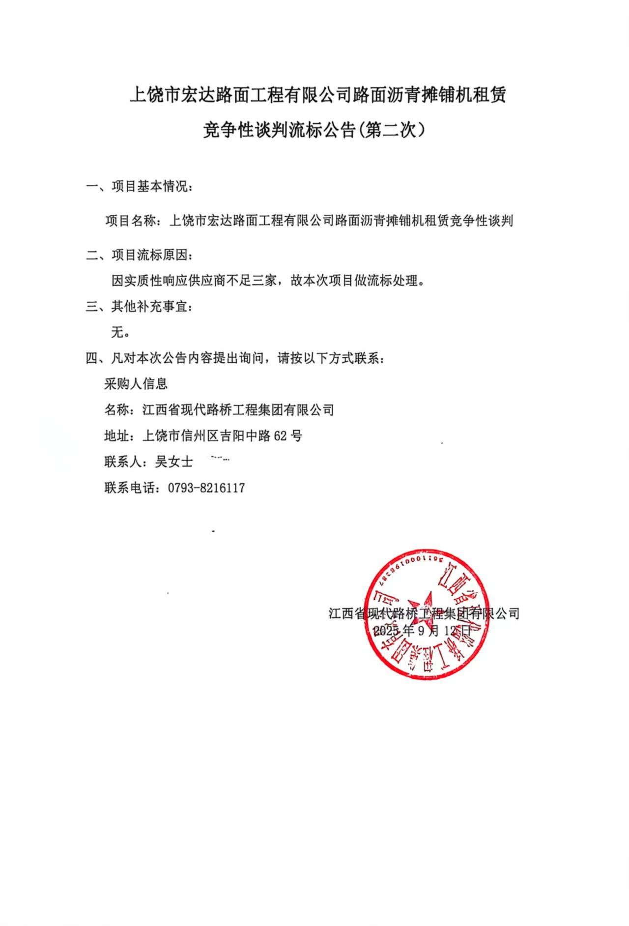 上饒市宏達(dá)路面工程有限公司路面瀝青攤鋪機租賃競爭性談判流標(biāo)公告(第二次)